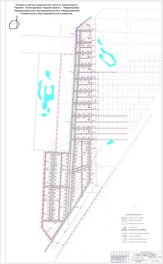 Рисунок 1.3 – Схема улично-дорожной сети и транспорта (проект планировки территории с. Червишево) Основная часть проекта планировки состоит из чертежа (чертежей) планировки территории, на которых находят отображение: красных линий кварталов; линий, отображающих дороги, улицы, проезды, линии связи, объекты инженерной и транспортной инфраструктур; границы зон планируемого размещения объектов социально-культурного и коммунально-бытового назначения, иных объектов капитального строительства; положения о размещении объектов капитального строительства, о характеристиках планируемого развития территории (рисунок 1.3). Материалы по обоснованию проекта планировки территории включают графическую часть и текстовую. Графическая часть содержит: - схему расположения планировочной структуры; - схему использования территории в период подготовки проекта планировки территории; - схему организации улично-дорожной сети; - схему движения транспорта на соответствующей территории; - схемы границ территорий объектов культурного наследия (рисунок 1.4); - схемы границ зон с особыми условиями использования территорий; -схемы вертикальной планировки и инженерной подготовки территории.