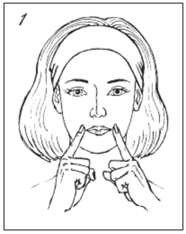 При выполнении этого упражнения дважды в день будьте готовы к разительным переменам: очень скоро уголки ваших губ поднимутся, и у вас больше не будет «материнского» скорбного вида. 12. Предпочтительное исходное положение – сидя на стуле. Представьте точки в центре каждой губы. Придайте рту форму овала, оттянув точки друг от друга и заверните губы на зубы. Взгляд направлен вверх, к темени. Средний палец положите на центр верхней губы, безымянный и указательный – по ее сторонам и слегка надавите.