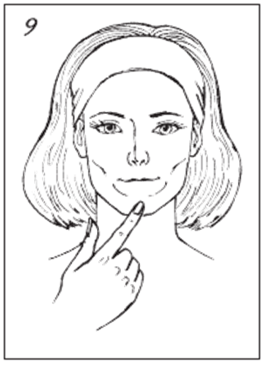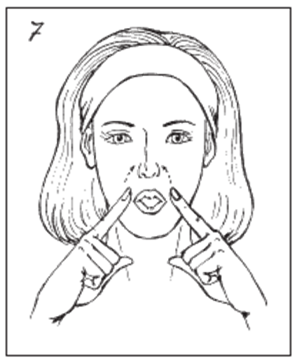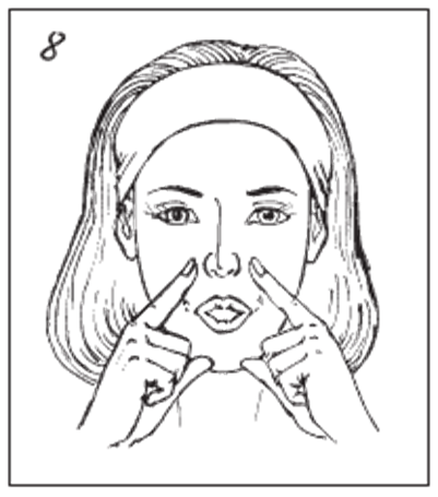 8. Почувствуйте, как энергия течет вверх от уголков рта по направлению к крыльям носа. «Подтолкните» ее указательными пальцами, проводя ими вверх по этой воображаемой линии. Затем представьте себе, что энергетический луч откатывается вниз вдоль линии, направляясь к уголкам рта. Повторите ощущение движения вверх-вниз, усиливая его с помощью указательных пальцев. Продолжайте делать упражнение до тех пор, пока в носогубных складках не появится чувство жжения. Когда это произойдет, помассируйте воображаемую линию вверх-вниз пульсирующими движениями указательных пальцев. Движения нужно выполнять быстро, про себя считая до 30. Одновременно выдувайте воздух сквозь сжатые губы.