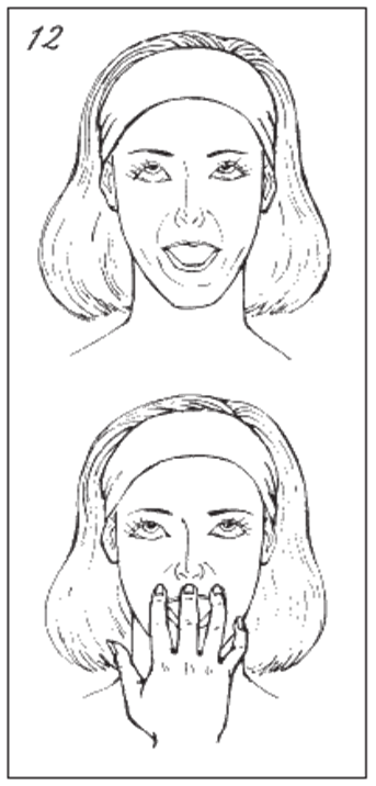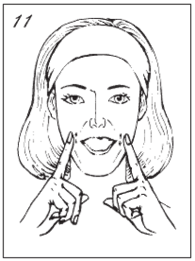 Прижмите к зубам верхнюю губу, после чего быстро улыбнитесь одними углами рта. Повторите эту улыбку не менее 80 раз. 11. Когда в уголках рта вы почувствуете жжение, проделайте указательными пальцами пульсирующие движения, считая при этом до 30. Затем сложите губы трубочкой и подуйте, чтобы дать мышцам отдых.