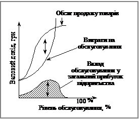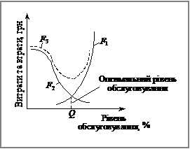 де η — рівень обслуговування, %; n — фактична кількість послуг, які надаються підприємством та його торговим посередником (торговими посередниками); N — кількість послуг, які теоретично можуть бути надані покупцеві; ti — термін виконання і -ї послуги. У чисельнику цієї формули — сумарна кількість часу, який фактично (чи за планом) витрачається на надання послуг покупцеві, у знаменнику — час, який теоретично можна витратити на виконання всього комплексу послуг протягом життєвого циклу товару. Фахівці підрахували, що за η = 70 % та вище витрати на сервісне обслуговування зростають експоненціально залежно від рівня обслуговування, коли ж η = 90 % та вище, сервіс стає невигідним для виробника, за зростання рівня обслуговування з 95 % до 97 % економічний ефект збільшується на 2 %, а витрати — на 14 %. Але зниження рівня обслуговування призводить до збільшення втрат, які пов’язують із погіршанням якості обслуговування. Тобто зростання конкурентоспроможності підприємства на ринку, яке залежить від зростання рівня обслуговування, супроводжується, з одного боку, зменшенням втрат на ринку, а з іншого — збільшенням витрат на сервіс. Тому спеціалісти визначають оптимальну величину рівня обслуговування за допомогою графіка — будують сумарну криву F 3, яка відбиває «поведінку» витрат і втрат залежно від зміни рівня обслуговування (рис. 12.1); вплив рівня обслуговування на загальну величину прибутку підприємства має форму співвідношення рівня запропонованої послуги та її прибутку (рис. 12.2).