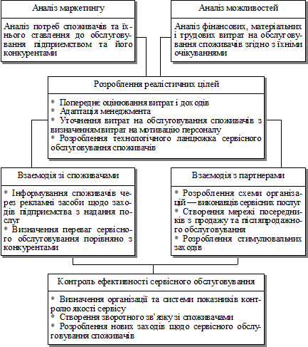 Рис. 12.2. Вплив рівня обслуговування споживача Для більшості підприємств-виробників загальними етапами менеджменту сервісним обслуговуванням є такі: · прогнозування обсягів сервісного обслуговування; · збирання інформації про послуги, що фактично надають- · визначення каналів просування послуг, створення, за необхідності, власної служби сервісного обслуговування покупців на всіх або окремих етапах життєвого циклу товару цього виробника; · оброблення отриманої інформації та прийняття стратегічних рішень щодо надання сервісних послуг (видів, якості, ціни, оптимізації отримання прибутку тощо); · створення та управління структурами сервісного обслуговування, управління базами даних, навчання персоналу, визначення та створення бази даних потенційних клієнтів; · розроблення на персональних комп’ютерах алгоритму прийняття рішення щодо надання послуг та супроводження виконання робіт із сервісного обслуговування; · комунікації з клієнтами, оцінювання потреб, переговори, моніторинг доведення інформації потенційних клієнтів про можливості надання певних послуг із сервісного обслуговування; · системне планування надання послуг на всіх етапах життєвого циклу товару, планування роботи сервісної мережі обслуговування товару виробника; · контроль комунікацій між виробником і клієнтами з надання послуг та якості виконання сервісних послуг окремим покупцям (за можливості — з кожним найбільш важливим); · отримання інформації про надання послуг за певний період часу та визначення їхньої фактичної ефективності; · поліпшення маркетингового мережевого адміністрування згідно з вимогами цільової аудиторії виробника. Фахівці визначають такі загальноприйняті норми створення та проведення сервісного обслуговування: · обов’язковість надання послуг. Підприємство, яке виробляє якісний товар, але не надає додаткових послуг, не має конкурентних переваг на ринку виробників, які надають певні послуги покупцеві; · необов’язковість застосування. Підприємство не повинне нав’язувати потенційному споживачеві (користувачеві) свої сервісні послуги; · еластичність сервісу. Підприємство має створити пакет сервісних послуг від мінімально необхідних до максимально доцільних; · зручність надання послуг. Сервісне обслуговування має бути надане у такому місці, у такий час та у такій формі, щоб це влаштовувало потенційного покупця; · технічна адекватність сервісних послуг. Сучасне підприємство має новітню технологію виготовлення товару. Якщо ж технічний рівень обслуговування не відповідатиме рівню виробництва, важко розраховувати на необхідну якість сервісного обслуговування покупця, а це, як наслідок, може відвернути такого покупця від виробника товару у майбутньому; · інформативна віддача сервісного обслуговування. Сервісне обслуговування є центром отримання інформації щодо експлуатації (використання) товару виробника, оцінок і рішень клієнтів, проведення сервісного обслуговування конкурентів, термінів проведення певного післяпродажного обслуговування тощо; · розумна цінова політика у сфері обслуговування. Сервісне обслуговування є інструментом маркетингу, стимулюючи придбання товарів підприємства-виробника і слугуючи інструментом зміцнення довіри покупців до такого підприємства та його товарів; · гарантована відп