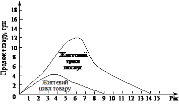 Рис. 12.9. Різниця у кривих життєвого циклу товару За визначенням фахівців, до 70 % доходів від продажу сервісних послуг припадають на останні два етапи. Тоді: · має місце сукупний ефект збільшення цін на сервісне обслуговування; · можлива модернізація товару, здійснювана за достатньо високими цінами; · надання додаткових нових видів послуг у міру фізичного та морального зношування та старіння товару. Підприємство-виробник починає отримувати прибуток від надання послуг з моменту купівлі товару та його використання. До 95 % прибутку підприємство отримує протягом останніх двох-трьох років після піку продажу товару. Чинниками, що сприяють зростанню прибутку, є: · зростання витрат на купівлю запасних частин для обладнання та устаткування, що виступають як товари підприємства-виробника; · зростання витрат на ремонт, пропорційне збільшенню віку таких товарів виробника; · зростання цін на надання послуг через необхідність проведення складніших ремонтів та інших видів обслуговування та потребу у підготовці кваліфікованішого персоналу. Тобто у той період, коли має місце четвертий етап життєвого циклу товару, життєвий цикл послуг тільки входить в етап швидкого зростання (рис. 12.10 та 12.11). Отже, визначивши етапи життєвого циклу товару та життєвого циклу сервісного обслуговування, застосувавши переваги окремих етапів, підприємство-виробник спочатку може отримувати прибуток від продажу товарів, а потім, за вмілого менеджменту сервісним обслуговуванням, — від продажу так званого додаткового продукту — супутніх цим товарам послуг, тобто зростання та нововведень сервісного обслуговування.