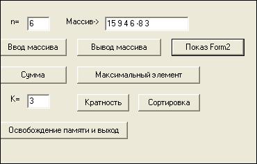 Var S,i:integer; Begin S:=0; For i:=0 to n-1 do S:=S+A[i]; Sum:=S End; Function Max; var amax,i:integer; begin amax:=A[0]; for i:=0 to n-1 do if A[i]>amax then amax:=A[i]; Max:=amax; end; Procedure Kratn; Var i:integer; Begin kk:=0; for i:=0 to n-1 do if A[i] mod k =0 then Begin SetLength(B,kk+1); B[kk]:=A[i]; kk:=kk+1 end; End; Procedure Sort; var i,k,x:integer; Begin for i:=0 to n-2 do for k:=i downto 0 do if A[k]>A[k+1] then begin x:=A[k];A[k]:=A[k+1];A[k+1]:=x end; End; End. Сценарий выполнения программы: 1. Запустить программу (Run); 2. На форме Form1 ввести в поле Edit1 значение n – количество элементов массива; 3. В поле Edit2 ввести “n” элементов массива целого типа; 4. Нажать кнопки: “ Ввод массива ”; “ Вывод масс ива”; “ Сумма ”; “ Максимальный элемент ”; 5. В поле Edit3 ввести значение “k” – коэффициент кратности; 6. Нажать кнопки: “Кратность”; “Сортировка”; “Показ Form2”; 7. Просмотреть и проанализировать результаты; 8. Активизировать форму From1 и нажать кнопку “ Освобождение памяти и выход ”; Ниже приведены вид формы Form1 после выполнения пунктов 2, 3, 4, 5: