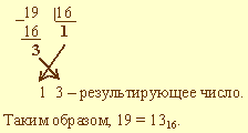 Пример 3.2. Выполнить перевод числа 19 в шестнадцатеричную систему счисления: