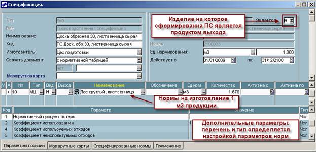 В средней панели окна редактирования спецификации укажите материальные нормы для изготовления 1 м3 полуфабриката Доска обрезная 30, лиственница сырая:
