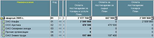 3. Откройте бюджет по Отделу Снабжения на 1 квартал с помощью типовой формы «Выплаты по закупке сырья и товаров Организации/Статьи» (вариант бюджета – «По документам»).