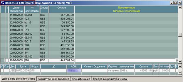Пометьте (Ins) Накладные №№ 05/001, 123, М/115, Б11, 01/022, 05/017 и в поле «Проведенные типовые хозоперации» (по любой помеченной записи) выберите ТХО ФО - Формирование факта по закупкам