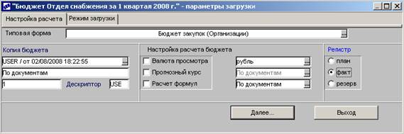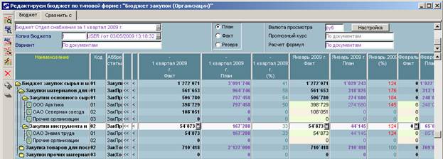 2. Просмотрите фактические показатели бюджета ЦО «Отдел снабжения» (1-й квартал), вариант бюджета – «По документам», типовая форма «Бюджет закупок (Организации)»: