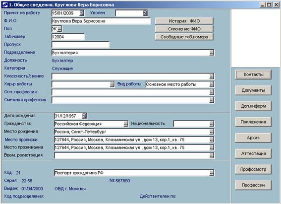 | | Управление персоналом Þ База данных Þ Картотека сотрудников