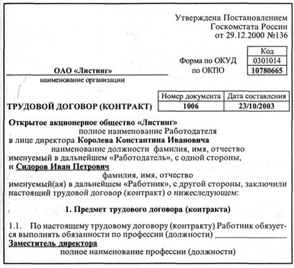 Щелчком по кнопке Договор (см. рис. Б. 14) можно перейти к просмотру и редактированию Трудового договора (Контракта), заключаемого между администрацией предприятия и принимаемым на работу сотрудником (текст этого документа отображается в формате.rtf в окне редактора Microsoft Word). Выше показана первая страница этого документа. В трудовом договоре подробно отражены «Права и обязанности сторон», «Режим работы, время отдыха и социально-бытовые условия», «Оплата труда».
