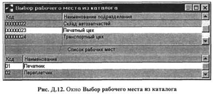 5. Итак, в справочники введены необходимые техоперации с определением их соответствия виду работ. Перейдем теперь к их более подробному описанию. Командами ТЭП → Нормативы → Технологические процессы откроем окно Техпроцессы, состоящее из двух панелей. В левой панели нужно открыть папку Готовая продукция, выбрать из списка «Учебное пособие «Информатика»», перейти в правую панель окна, нажать клавишу [F7] и заполнить заголовок техпроцесса (рис. Д. 11). В окне рис. Д. 11 заполняем поля: • Обозначение изделия - обозначение техпроцесса, содержит до 20 символов, в качестве обозначения принимаем первые 20 символов Наименования изделия; Наименование изделия - в качестве наименования техпроцесса принимаем название изготовляемой продукции Учебное пособие «Информатика»; • Код технологической классификации - код классификации Эти три поля заполняются вводом с клавиатуры. Значения следующих двух полей выбираются нажатием клавиши [F3] из соответствующих каталогов: • Цех-изготовитель - код и наименование цеха-изготовителя по каталогу подразделений; • Рабочее место - номер последнего по маршруту рабочего места в цехе-изготовителе (по каталогу рабочих мест), при необходимости можно отредактировать каталог рабочих мест и/или пополнить его (рис. Д. 12). Как видно из рис. Д. 12, в печатном цехе созданы два рабочих места: Печатник и Переплетчик.