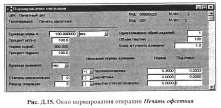 Это окно предназначено для редактирования техпроцесса: перечня операций, норм времени, комплектующих и материалов, необходимого инструмента, документов, описывающих технологии. Окно состоит из трех панелей. В верхней панели отображаются: наименование и обозначение изделия, техпроцесс для которого корректируется, наименование и обозначение самого техпроцесса, режимы просмотра и редактирования техпроцесса, кнопка перехода к редактированию заголовка техпроцесса Заголовок. Также в верхней панели окна Описание технологического процесса в полях Состояние па и Все записи устанавливаем режим просмотра техопераций, отображаемых в средней панели. В поле Все записи с помощью клавиши [F3] вводится одно из двух значе ний: да или нет, только на дату. В первом случае записи о техо-перациях, период действия которых не включает указанную дату или которые находятся в состоянии Запись не активна, будут отображаться в средней панели окна с пометкой «→ в столбце Отм. Во втором случае подобные записи вообще не будут отображаться на экране. В средней панели окна рис. Д. 14 приведена таблица операций техпроцесса. В ней отображаются названия и номера операций, подразделения, в которых операции выполняются. Используя соответствующие клавиши, можно вводить новые ([F7]), удалять ([F8]) либо редактировать ([F4]) техопераций. Вводим три операции описываемого техпроцесса: Резка бумаги, Печать офсетная, Переплет. Нижняя панель окна рис. Д. 14 содержит экранные кнопки для вызова окон редактирования материальных и трудовых норм, состава оборудования, инструмента и документации, необходимых для выполнения операции, выделенной в средней панели. Кроме того, в нижней панели можно ввести период действия и состояние текущей (т.е. выделенной в средней панели) записи списка технологической операции. Нажатием клавиши [F4] переходим к редактированию параметров нормирования операции, активизированной в средней панели окна рис. Д. 14. Эта процедура выполняется в окне Нормирование операции (рис. Д. 15).