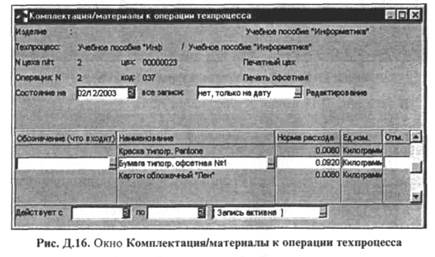 В верхней панели окна Нормирование операции отображаются данные о цехе и техопераций. В средней панели представлены параметры нормирования операции: • Единица норм-я (единица нормирования) - количество исходного изделия, на которое задаются нормы, задаем 100 экз.; • Одновременно обраб. изделий - количество изделий, которые в данной техоперации обрабатываются одновременно; • Процент исп-я - процент использования данной операции в технологическом процессе, если операция выполняется не постоянно; • Объем партии - объем технологической партии выпуска; • Норма выраб. (норма выработки) - количество изделий, изготовляемых одним рабочим за единицу времени. Рассчитывается делением Единицы нормирования на сумму значений полей Норма и Подг/закл. Поле закрыто для редактирования; • Процент годных - средний процент годных изделий после выполнения данной операции; • Единица времени - единица времени, на которую вводится норма. Выбор значения осуществляется нажатием клавиши [F3], по умолчанию поле принимает значение час; • Степень механизации - код степени механизации труда по ОКПДТР; • Разряд операции - разряд специалиста, выполняющего операцию. В теме Б, посвященной описанию контура Управление персоналом, установлен для штатной единицы печатника 5-й разряд, этот разряд введем в данное поле; • Название нормы времени - определяет вид применяемой нормы времени. Не имея здесь возможности углубляться в проблемы экономики труда, отметим, что могут использоваться технологическая, расчетная и опытно-статистическая нормы. Используемая норма времени (в данном случае технологическая) выбирается нажатием клавиши [F3] слева от соответствующего названия; • Норма - величина основной нормы времени на выполнение операции. Единица измерения берется из поля Единица времени; • Подг/закл. - величина нормы подготовительно-заключительного времени. Единица измерения берется из поля Единица времени. При расчетах по техпроцессу величины из полей Норма и Подг/ закл. складываются и образуют норму времени на операцию. Таким образом, норма выработки для операции Печать офсетная составляет 300 экз,/ч. Аналогичным образом введем нормы на операцию Резка бумаги (5000 экз./ч) и Переплет (240 экз./ч) в окнах Нормирование операции, аналогичных показанному на рис. Д. 15. 6. Перейдем теперь к вводу материальных норм (кнопка Мат. нормы на рис. Д. 14). Введем материальные нормы на один экземпляр учебного пособия: бумага типографская офсетная № 1 - 0.092 кг, картон обложечный «Лен» - 0.0080 кг, краска типографская Pantone - 0.008 кг, клей ПВА - 0.010 кг. В операции Печать офсетная используются МЦ: бумага типографская офсетная № 1, картон обложечный «Лен», краска типографская Pantone. В операции Переплет используется МЦ клей ПВА. В качестве примера рассмотрим процесс ввода материальной нормы для МЦ бумага типографская офсетная № 1. Щелчком по кнопке Мат. нормы {см. рис. Д. 14, выделена операция № 2) переходим в окно Комплектация / материалы к операции техпроцесса (рис. Д. 16). В таблицу, расположенную в нижней панели окна, вводим МЦ, используемые в данной операции: бумага типографская офсетная № 1, картон обложечный «Лен», краска типографская «Pantone».