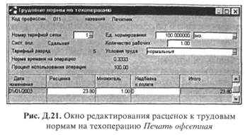 Каждое из этих окон состоит из трех панелей. В верхней панели приведены сведения об изделии, применяемом техпроцессе, выбранной техоперации. В средней панели окна представлен список профессий специалистов, требуемых для выполнения техоперации. С помощью клавиши [F7] можно добавлять в этот список необходимые профессии. В случае отсутствия нужной профессии имеется возможность пополнить каталог профессий, не выходя из данного модуля. Нижняя панель содержит поля для ввода периода действия и признака активности текущей нормы. Как видно из рис. Д. 18, в данном случае выбрана операция № 2 - Печать офсетная, причем для выполнения этой операции требуются специалисты только одной профессии - печатники. В средней панели заполняем следующие столбцы: • КОД - код профессии и Название профессии - выбираются из каталога профессий, причем эти два поля заполняются одновременно с помощью клавиши [F3]; • Количество рабочих - количество рабочих, требуемых одновременно для выполнения операции, вводится с клавиатуры; • Отм. - отметка активности записи, для активных записей этот столбец не заполнен. В нижней панели содержится расшифровка отметки активности. Добавление новых записей в список профессий проводится с помощью клавиши [F7], удаление - [F8]. В случае необходимости в приведенных окнах редактирования норм следует заполнить сроки их действия.