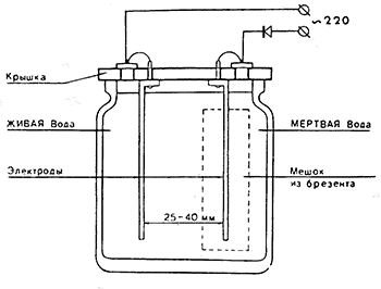 Литровая банка, 2 электрода из нержавеющей стали, расстояние между ними 40 мм, не достают до дна. Нержавейка размером 40х160х0,8 мм. Процесс приготовления воды длится 3-8 минут в зависимости от необходимой крепости. После приготовления, отключив вилку от сети и вынув устройство, быстро вытащить мешочек и вылить "М" воду в другую посуду. Живая вода (щелочная) (-) -- Мёртвая вода (кислотная) (+) Эскиз. - Прибор для получения "живой" и "мёртвой" воды. Электрод - 2 шт. нержавеющая сталь 0.8х40х160 мм. Ёмкость - 1 литр. Время - 3-8 минут.