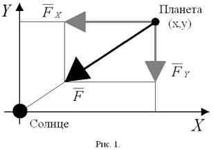 В качестве примера решения основной задачи механики с помощью метода численного интегрирования рассмотрим расчет движения орбиты планеты[3] вокруг Солнца. Предположим, что Солнце бесконечно тяжелое в том смысле, что его движение не будет приниматься в расчет. Допустим, что планета начинает свое движение в известное точке и имеет в этой точке определенную скорость (начальные условия). Планета движется вблизи Солнца по какой-то кривой, и мы попытаемся определить с помощью уравнений движения Ньютона и его же закона всемирного тяготения, что это за кривая. В некоторый (начальный) момент времени планета находится в каком-то определенном месте; на расстоянии от Солнца; в этом случае на нее действует сила , направленная по прямой к Солнцу: (см. рис.1). Чтобы рассуждать дальше, надо выяснить какое ускорение вызывает эта сила. Выберем координатную систему X, Y, Z таким образом, чтобы Z-координата как скорости, так и силы равнялась нулю. Тогда не будет никаких причин у планеты в своем движении выйти за плоскость XY, и задача станет двумерной. Из рис.1 видно, что горизонтальная компонента силы ( ) так относится к полной ее величине , как координата относится к расстоянию ( ). Это следует из подобия треугольников. Кроме того, если положительна, то отрицательна, и наоборот.