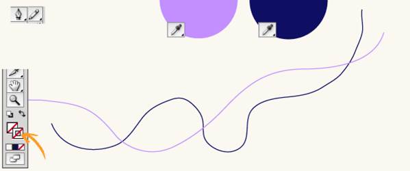 Рисование линий Выберем инструмент Pen Tool (P) или Pencil Tool (N) и нарисуем две линии, как показано на рисунке 2. Я сделала линии толщиной 2 pt. Выдилим сначала одну линию. Убедимся, что окошко цвета обводки активно (рисунок 2). Выберем Eyedropper Tool (I) и, с нажатой клавишей Shift, кликнем по сиреневому кругу. Так мы закрасили линюю в сиреневый цвет.