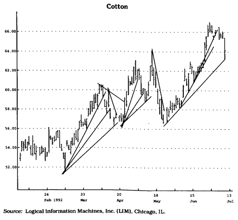 Движение цен диктуется спросом и предложением. Если спрос превышает предложение, то цены растут; и, наоборот, если предложение превышает спрос, то цены падают. Все экономисты разделяют эти основополагающие принципы. Графически два вышеупомянутых феномена изображаются так, как показано на рис. 1.1 и рис. 1.2: предложение — нисходящей линией, спрос — восходящей. Сложность заключается в выборе особых точек, через которые проходят эти прямые линии (см. рис. 1.3). Как правило, аналитик привносит изрядную долю субъективизма в построение линий тренда. Так, движение цен на рынке принято рассматривать в ретроспективе — от прошлого к будущему, поэтому и даты на графике перечисляются слева направо. Соответственно линии спроса и предложения строятся и располагаются на графике слева направо. Интуиция подсказывает, что это неверно. Движение цен в настоящий момент гораздо важнее, чем движение рынка в прошлом. Иными словами, стандартные линии тренда должны вычерчиваться справа налево так, чтобы в правой части графика были самые последние данные о состоянии рынка. Поначалу это может показаться необычным, но мой собственный опыт и обширные наблюдения подтверждают целесообразность такого подхода. Не стоит жертвовать точностью и логикой во имя простоты. Общепринятая процедура построения множества линий тренда, из которых одна милостиво полагается верной,