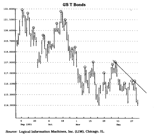 также грешит неточностью и полным невниманием к мелким деталям. Между тем успешное применение линий тренда требует от аналитика повышенной внимательности и последовательности. Вместо того чтобы просто сформулировать набор правил для верного отбора критических точек, я хочу рассказать одну поучительную историю, которая произошла со мной и моим коллегой лет двадцать тому назад. Она послужила своего рода катализатором и полностью перевернула мои воззрения как аналитика. В ту пору я и мой коллега — начинающие трейдеры — были полностью поглощены рыночной стихией. Анализ движения цен стал не просто нашей профессией — он буквально превратился в наваждение. Вернувшись домой, мы хватались за телефонные трубки и часами обсуждали необычные графические модели. В один из таких вечеров мы долго обсуждали взаимодействие различных тенденций в развитии цен. Затем каждый из нас построил на своем графике соответствующие линии тренда. Когда на следующий день, придя на работу, мы сравнили графики, оказалось, что начерченные нами линии даже отдаленно не напоминают друг друга. Все это меня сильно озадачило. Получалось, что все это время мы разговаривали друг с другом на разных языках. Я решил немедленно с этим покончить. Чтобы избежать непонимания и путаницы в дальнейшем, нужно было разработать единую терминологию и точно определить понятия. И я приступил к каталогизации и стандартизации широко использующихся методов технического анализа, стремясь усовершенствовать их и разработать свои собственные. До сих пор эта работа не закончена. Первым объектом моего пристального внимания стали линии тренда. Для иллюстрации и обоснования своих теоретических положений я буду пользоваться дневными графиками и данными о дневных ценах, хотя все рассматриваемые закономерности распространяются и на любой другой промежуток времени. Причины, по которым я выбрал именно дневные графики, сводятся к следующему: 1. Дневная информация является наиболее легко доступной; десятилетиями аналитики работали преимущественно с дневными графиками; 2. Используя дневные графики, трейдер избавлен от необходимости постоянно следить за внутридневным поведением рынка; он меньше рискует попасться в ловушку из-за нередких корректировок цен, которые являются "болезнью" внутридневных баз данных; 3. Вероятность заключения сделки по цене, наиболее близкой к указанной в приказе увеличивается, если тревдер пользуется рыночными сигналами, основанными на дневной информации.