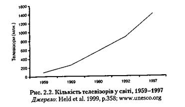 вона відрізняється від бібліотеки, навіть якщо ми не враховуватимемо об'єму рекламних матеріалів. Передовсім, інформація в мережі не впорядкована — ані в алфавітному порядку, ані будь-яким іншим чином. Різні теми поєднуються згідно з мінливими, часто примхливо дивними засадами. Мережа також не ієрархічна, і сайт, що належить вмілому студенту, може бути таким же привабливим і займати на екрані стільки ж місця, як і власна сторінка «Microsoft». Іншими словами, мережа є неймовірно демократичною і децентралізованою, і це, мабуть, одна з головних причин, чому різні сили докладають таких зусиль, намагаючись регулювати її. Як добре відомо, там є величезна кількість порнографії усіх видів; якщо добре роздивитися, то можна знайти також політичну пропаганду й прокльони усіх видів, заклики до порушення закону, ексцентричні висловлювання і — звичайно ж — терабайти реклами. Деякі песимісти побоюються, що мережа просто виродиться у ще одну арену для маркетингу; на щастя, вони помиляються. Як і старі засоби інформації, основані на целюлозі, мережа може певною мірою розглядатися як звичайний засіб інформації, порожня посудина, яка може бути наповнена практично усім. Вона, однак, впливає також на формування змісту. Це значно швидший засіб інформації, ніж, скажімо, оправлений у шкіру том стоїчної філософії. На противагу точці зору МакЛюена, засіб інформації не є повідомленням, але засіб інформації оформлює повідомлення. Історія філософії не просто виглядає інакше на компакт-диску або у вигляді роману чи фільму, аніж книжка на 500 сторінок без ілюстрацій чи, вже як на те пішло, гіперпосилань. Вона є іншою. Можливо, неправда, що певні думки можуть бути викладені лише німецькою мовою (як начебто вірять деякі спеціалісти по Гайдеґґеру), але певні думки є довшими від web-сторінки і обов'язково взаємопов'язані з іншими думками послідовним чином, а не за допомогою гіперпосилань. До того ж, на відміну від друкованих засобів інформації, зміст мережі постійно змінюється. Компанії, які поважають себе, вже не просто мають свої web-сайти; вони хочуть покращити свої web- сайти. Не можна гарантувати, що сторінка, яка була доступною вчора, буде доступною і сьогодні. Посилання повинні модернізуватися щомісяця. Зміна — це не надзвичайний стан, а риса щоденного життя. Кількість користувачів інтернету зросла дуже швидко (див. Рис. 2.1).