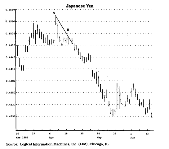 Рис. 1.10 Если продолжить линию предложения, соединяющую точки предложения А и В, то она пересечет столбик цен дня, следующего сразу после точки предложения В, причем ниже цены закрытия этого дня. На графике видно, что разрыв, соответствующий столбцу праздничного дня, несколько сместил динамику цен. Но даже если скорректировать график с учетом этого фактора, цена закрытия через день после регистрации точки В все равно окажется выше линии предложения. Следовательно, истинность этой линии тренда под сомнением. Date: 2015-07-25; view: 352; Нарушение авторских прав |