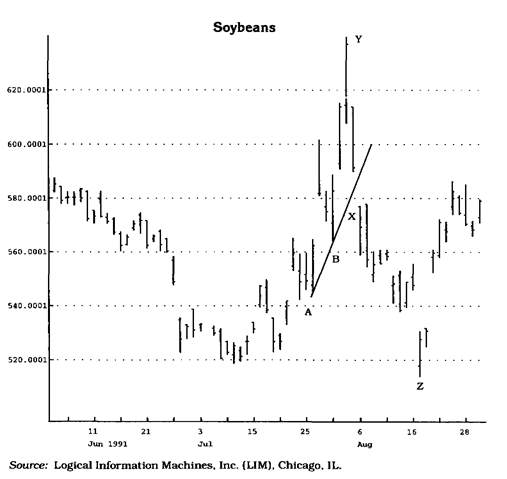 Рис. 1.13 После того, как произошел ценовой прорыв вверх TD-линии предложения А-В, движение цен повторилось в зеркальном отражении. Ценовой ориентир Z рассчитывается следующим образом: разность между минимальной ценой ниже TD-линии (Y) и ценой на TD-линии в тот же день (X) прибавляется к цене прорыва.