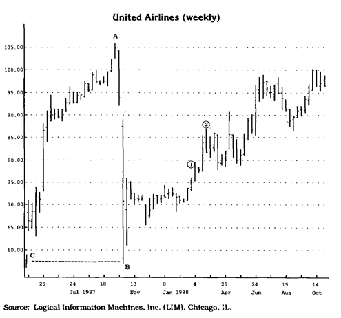Исследуя коррекцию, я много лет назад открыл более важный уровень, который служит уровнем поддержки или сопротивления. Я назвал этот ценовой уровень "магнитной ценой". Признайтесь, что вы и сами не раз попадались в подобную ловушку. Ожидая прорыва в критической точке (будь то ценовой максимум или ценовой минимум), вы с трепетом наблюдали, как цены останавливались и начинали двигаться в противоположном направлении как раз в тот момент, когда вы собирались открыть или закрыть позицию. Или, наоборот, вы ожидали, что уровень поддержки установится на внутридневном минимуме, а уровень сопротивления на внутридневном максимуме, но цены "проскакивают" через критическую точку и быстро приближаются к уровню с коэффициентом 1,382. Как правило, такие резкие скачки цен происходят именно тогда, когда их никто не ждет. Следует отметить, что существуют и исключения из описанных выше правил определения величины коррекции. Опыт подсказывает, что приведенные примеры характерны для ситуаций, когда цены колеблются в определенном торговом коридоре (trading range). Если цены поднимаются до рекордных значений, выбор критической точки (ценового минимума) становится невозможным, поскольку слева на графике нет ни одного ценового пика. В таких случаях я обычно умножаю максимальную цену на коэффициенты 0,618 и 0,382. В этой связи мне вспоминаются два случая. Первый — это когда я предсказал обвал на фондовом рынке в 1987 году, выступая перед группой биржевиков в Нью-Йорке. В то время августовский ценовой максимум промышленного индекса Доу-Джонса составлял примерно 2747, что являлось рекордным показателем. Умножив это значение на коэффициент 0,618, я смог рассчитать уровень поддержки (коррекции), который составил примерно 1697 (см. рис. 2.6а).