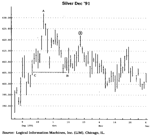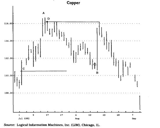 Рис. 2.1 Определив ценовой минимум В, найдите слева на графике ближайший к нему день, когда минимальная цена была ниже, чем минимальная цена в день В (точка Q. Максимальная цена между этими двумя точками (А) является критической ценой. Это важный исходный ценовой уровень для расчета корректирующего подъема вверх. Чтобы определить возможные уровни коррекции вверх, найдите разность между ценами в точках А и В и умножьте ее на коэффициенты коррекции. Обратите внимание, что цены столкнулись со значительным препятствием на уровне цены закрытия в точке А, а не на уровне внутридневного максимума этого дня (см. далее обоснование "магнитной цены" и рис. 2.5).
