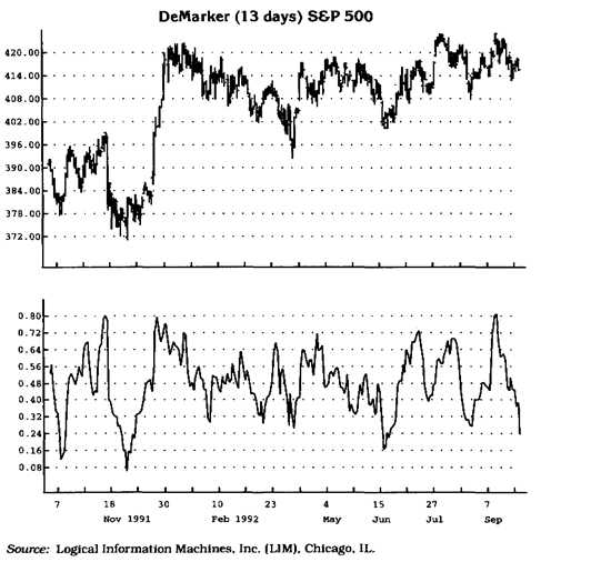 Индикатор Демарка строится на основе следующих сопоставлений. Внутридневной максимум текущего дня сравнивается с внутридневным максимумом предыдущего дня. Если внутридневной максимум текущего дня выше, то регистрируется соответствующая разность. Если внутридневной максимум меньше или равен внутридневному максимуму предыдущего дня, то регистрируется нулевое значение. Затем полученные таким образом разности за 13 дней суммируются. Полученное значение становится числителем индикатора Демарка и делится на ту же самую величину плюс сумма разностей между ценовыми минимумами предшествующего и текущего дней за 13 дней. Если ценовой минимум текущего дня больше того, который был день тому назад, то фиксируется нулевое значение. Таким образом, создан простой и чувствительный индикатор, способный предсказывать поведение цен. На рисунках 3.7 и 3.8 это явление наглядно продемонстрировано. На графике показано, как индикатор колеблется от О до 100. Когда показания индикатора опускаются ниже отметки 30, то ожидается разворот цен вверх. Когда показания инди катора поднимаются выше отметки 70, то ожидается разворот цен вниз. Как и индикатор REI, индикатор Демарка предназначен для выявления областей с высоким и низким риском для покупки. Но если ВЫ, чтобы определить истинную тенденцию на рынке, сравнивает цены через день, индикатор Демарка сравнивает цены данного и предыдущего дней. Кроме того, REI рассчитывается с помощью ценовых значений, полученных за 8 дней, а Индикатор Демарка — за 13 дней. (Временной параметр обоих индикаторов может быть свободно изменен.) Ниже приводится текст компьютерной программы расчета индикатора Демарка (см. таблицу 3.3).