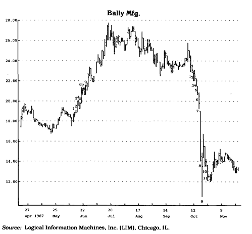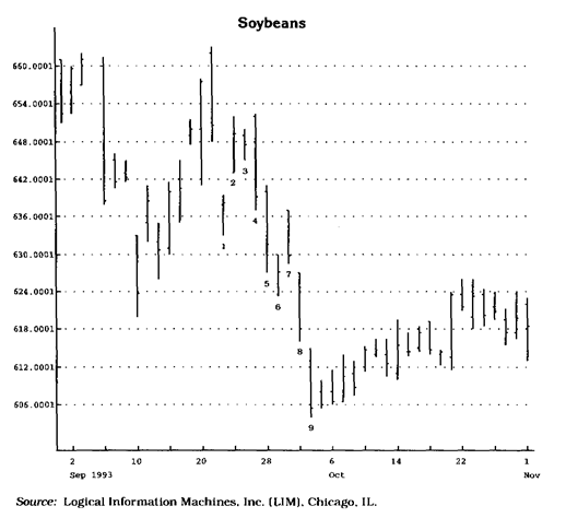 Рис. 7.40 Как видно из графика, возрастающий девятидневный установочный набор, отмеченный цифрами, не превзошел максимальный уровень убывающего установочного набора, начавшегося за 11 дней до октябрьского ценового минимума.