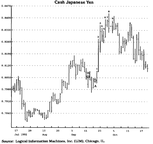 Рис, 7-6 Цена закрытия в день В больше или равна цене закрытия в день А. Цена закрытия на следующий день меньше цены закрытия четыре дня тому назад, и этому дню присваивается номер 1 в установочном наборе. Обратите внимание, что девятый день оказался последним днем нисходящей тенденции — рынок достиг основания.