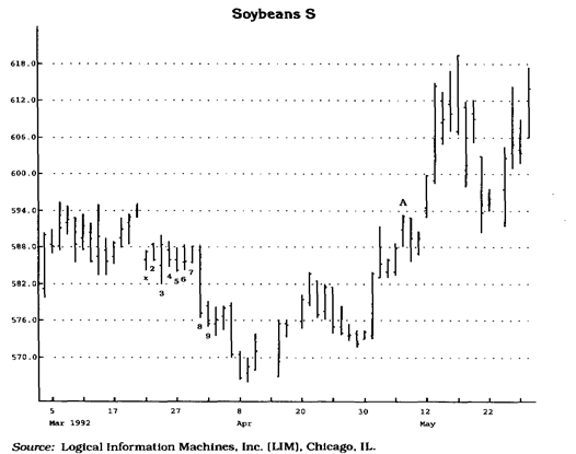 Рис. 7.18 Обратите внимание, как в точке А на графике цена закрытия превышает наибольшую максимальную цену установочного набора на покупку в конце марта. Столбики установочного набора отмечены на графике цифрами.