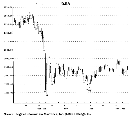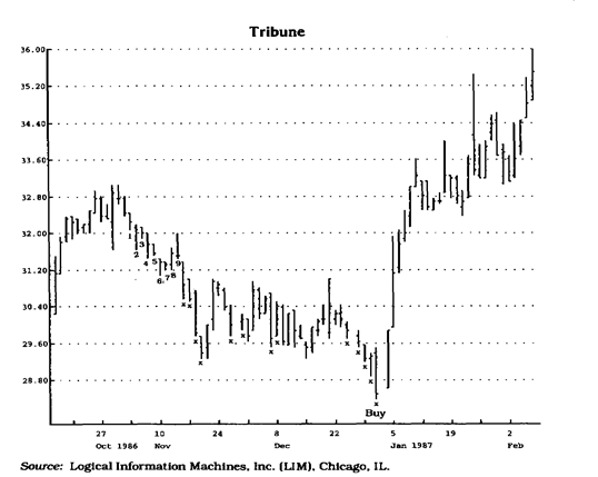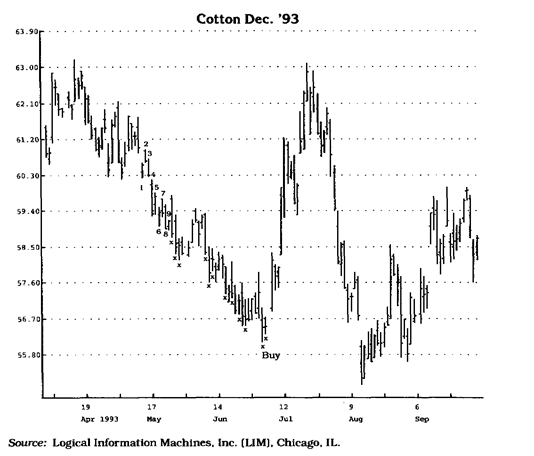 Рис. 7.39 Ожидание подтверждения сигнала двувдневным "подскоком" цены создает менее благоприятные условия для вхождения в рынок, чем совершение покупки на цене закрытия тринадцатого дня.