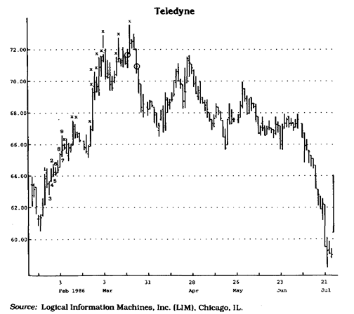 Рис.7.36 Обратите внимание на первую цену закрытия (в кружке), зафиксированную после тринадцатого дня (сигнал к продаже), которая оказалась меньше минимальной цены два дня тому назад.