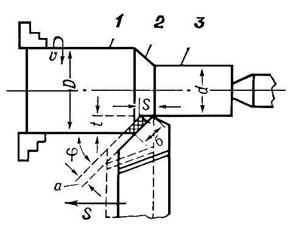 Рисунок 8.1 – Елементи режиму різання при точінні: 1 – оброблювана поверхня; 2 – поверхня різання; 3 – оброблена поверхня. D – діаметр оброблюваної заготовки; d – діаметр деталі після обробки; a і б – товщина і ширина шару, що зрізується.