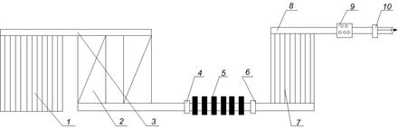 Рис. 6.1 Схема расположения оборудования современного сортового стана 1-стеллажи для заготовок; 2-подводящий печной рольганг; 3-нагревательные печи; 4-ножницы; 5-рабочие клети; 6-летучие барабанные ножницы или дисковая салазковая пила для горячей резки металла; 7-реечный холодильник; 8-отводящий рольганг; 9-роликовая правильная машина; 10-ножницы или пила холодной резки