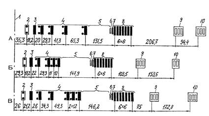Рис. 8.1. Компоновка непрерывных станов горячей прокатки А – стан 2000 НЛМК; Б – стан 2000 ЧерМК; В – стан 2000 ММК; 1 – ось последней нагревательной печи; 2 – черновой окалиноломатель с вертикальными валками; 3 – черновая двухвалковая клеть; 4 – черновые универсальные четырехвалковые клети; 5 – промежуточный рольганг; 6 – летучие ножницы; 7 – чистовой окалиноломатель; 8 – чистовые четырехвалковые клети; 9 – моталки для тонких полос; 10 – моталки для толстых полос После прокатки в черновой группе подкат толщиной 25-50 мм с температурой 1000-1120° С (меньшее значение температуры соответствует меньшей толщине подката) по промежуточному рольгангу поступает в чистовую группу клетей. Перед чистовой группой установлены ножницы для обрези переднего и заднего концов раската. В чистовом окалиноломателе валки прижимаются к металлу с помощью пружинных стаканов. При обжатии полосы на 0,2-0,4 мм разрушается слой окалины, образовавшийся при прохождении промежуточного рольганга. Раздробленная окалина удаляется гидросбивом. Клети чистовой группы расположены на близком расстоянии друг от друга и полоса при прокатке может одновременно находиться во всех клетях. Для получения стали с мелким и равномерным зерном прокатку в последней клети необходимо проводить при температуре 850-950° С, а смотку полосы в рулон — 500-650° С. Для ускоренного охлаждения раскатов над отводящим рольгангом и под ним установлены устройства для интенсивной подачи воды (до 12000 м3/ч). Передний конец полосы заправляют в моталку при скорости прокатки не выше 10 м/с, а затем ее повышают до максимальной (20 м/с). При этом ускорение составляет 0,05-0,1 м/с2, что способствует выравниванию температуры по длине полосы (при ускорении происходит разогрев металла по длине из-за увеличивающейся скорости деформации). Смотка полос осуществляется в одной из двух групп моталок. Ближайшая к клетям группа моталок предназначена для быстро остывающих полос толщиной 1,2-5 мм, а дальняя — для более толстых. После смотки рулоны поступают по подземному конвейеру в цех холодной прокатки или в отделение отделки горячекатаных рулонов. Стан 2000 Череповецкого металлургического комбината (1975 г.) аналогичен стану 2000 Новолипецкого металлургического комбината. Основные отличия состоят в следующем: — установлено четыре нагревательных печи с шагающими балками; — три последние черновые клети объединены в непрерывную подгруппу, что позволило сократить длину черновой группы на 83 м; — в чистовой группе предусмотрена возможность установки восьмой клети. Непрерывный стан 2000 ОАО "ММК" является последним из серии таких станов, спроектированных и изготовленных производственным объединением "Ново-Краматорский машиностроительный завод". Стан предназначен для производства горячекатаных полос из непрерывно-литых слябов массой до 45 т, толщиной 250 мм, шириной 750-1850 мм и длиной 4,8-12 м. Нагрев слябов до температуры прокатки производится в трех методических печах с шагающими балками. Производительность каждой печи 460 т/ч. В дальнейшем предусмотрена установка четвертой печи. Стан имеет черновую группу, включающую вертикальный окалиноломатель, двухвалковую клеть и пять универсальных клетей кварто, из которых три последних объединены в непрерывную подгруппу, а также чистовую группу в составе горизонтального окалиноломателя и семи клетей к
