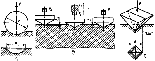 Рис. 5.15. Схемы определения твердости: а – по Бринеллю; б – по Роквеллу; в – по Виккерсу