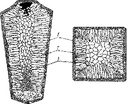 Слиток состоит из трех зон: 1. мелкокристаллическая корковая зона; 2. зона столбчатых кристаллов; 3. внутренняя зона крупных равноосных кристаллов. Кристаллизация корковой зоны идет в условиях максимального переохлаждения. Скорость кристаллизации определяется большим числом центров кристаллизации. Образуется мелкозернистая структура. Жидкий металл под корковой зоной находится в условиях меньшего переохлаждения. Число центров ограничено и процесс кристаллизации реализуется за счет их интенсивного роста до большого размера. Рост кристаллов во второй зоне имеет направленный характер. Они растут перпендикулярно стенкам изложницы, образуются древовидные кристаллы – дендриты (рис. 3.8). Растут дендриты с направлением, близким к направлению теплоотвода.