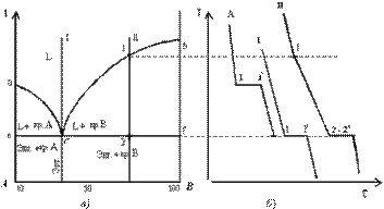 Рис. 4.2. Диаграмма состояния системы с полной нерастворимостью компонентов в твердом состоянии (1 рода) (а) и кривые охлаждения сплавов (б)
