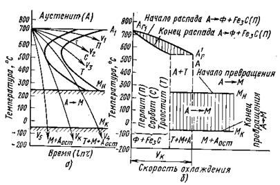 Рис. 9.9. Наложение кривых охлаждения на диаграмму изотермического распада аустенита (а), схема влияния скорости охлаждения на температуру превращения аустенита (б).