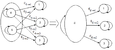 Во многих приложениях определение асимптотических (стационарных) значений вероятностей состояний с помощью моделей пространств состояний можно упростить, если объединить некоторые множества состояний для того, чтобы они образовали единичное совокупное состояние. После объединения групп состояний возникает новый процесс с некоторыми новыми состояниями (совокупными состояниями) и с новыми переходами (между совокупными состояниями). В большинстве случаев новый процесс уже не будет Марковским, потому что продолжительности пребывания системы в совокупных состояниях, вообще говоря, распределены не по экспоненциальному закону. Новый процесс останется Марковским только при удовлетворении условия объединяемости – условия, при котором интенсивности перехода к любому другому состоянию или к группе объединенных состояний одинакова для всех состояний, входящих в рассматриваемую группу. При выполнении этого условия можно рассчитать вероятности нахождения системы в любом состоянии не только для стационарных, но и для нестационарных процессов. Поясним сказанное выше на примере объединения двух состояний системы в одно (рис. 5.4). Процесс останется Марковским, то есть интенсивности переходов q 6®1, q 6®2, и q 6®3 останутся независимыми от времени при выполнении следующих условий: q 4®1 = q 5®1, q 4®2 = q 5®2, и q 4®3 = = q 5®3. При этом неважно, равны или нет интенсивности q 4®1, q 4®2 и q 4®3. Выведем формулы для вычисления вероятностей и частоты возникновения совокупных состояний. Рассмотрим схему (рис. 5.5), в которой несколько состояний j объединены в одно совокупное состояние J. Вероятность состояния J, обозначаемая PJ, равна сумме всех вероятностей Pj: