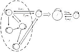 где при втором преобразовании была выполнена подстановка по формуле (5.8). Чтобы найти решение, используя пространство состояний, получившееся после объединения состояний j, необходимо знать обозначенные на рис. 5.5 интенсивности переходов qi®J и qJ®i. Их можно вычислить, исходя из того, что частота переходов от i к J должна быть такой же, как частота переходов от i ко всем состояниям j до их объединения, и аналогично для переходов от J к i. Согласно (5.8) эти требования можно представить как