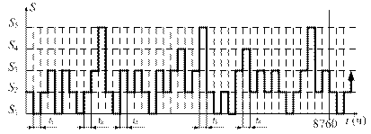 2. Составить диаграмму пространства состояний для данной системы, которая имеет три состояния: S 5, S 6, S 7. Определить с помощью этой диаграммы вероятности нахождения системы в работоспособном состоянии, состоянии аварийного ремонта и в состоянии планово-предупредительного ремонта для установившегося (стационарного) процесса. Задача №2. Временная диаграмма состояний системы, которая может находиться в пяти состояниях, представлена на рис. 5.20. Известно следующее: - продолжительность пребывания системы в каждом из состояний подчинена экспоненциальному закону; - средняя продолжительность пребывания системы в каждом из состояний: