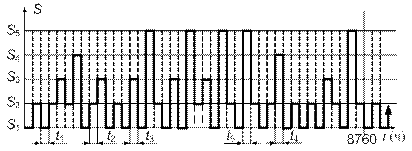 Задание: 1. Составить диаграмму пространства состояний по данной временной диаграмме состояний системы. Определить: - частоту появления каждого из состояний (W1, W2, W3, W4, W5 – 1/год); - вероятности нахождения системы в каждом из пяти состояний в стационарном режиме работы (P 1(¥), P 2(¥), P 3(¥), P 4(¥), P 5(¥)); - интенсивности переходов из состояния в состояние (q 1®2, q 1®3, q 3®2, q 4®5 и т. д. – 1/год).