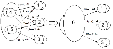 Ответ: Вопросы для самоподготовки 1. Что образует пространство состояний системы? 2. Изобразите диаграмму пространства состояний для системы, которая может находиться в четырех состояниях. Поясните, какие из ее элементов обозначают состояния, а какие – события. 3. Какое мнемоническое правило используют при составлении уравнений Чемпена – Колмогорова? 4. Запишите общий вид уравнений Чемпена – Колмогорова в установившемся режиме (при t→∞). 5. Приведите формулу связи между частотой возникновения и продолжительности состояния с вероятностью нахождения системы в i-м состоянии и интенсивностью переходов для стационарных процессов. 6. О чем говорит условие объединяемости? 7. На рис. 5.30 показан процесс объединения состояний 4 и 5 в состояние 6. Выполняется ли в новой диаграмме пространства состояний условие объединяемости?
