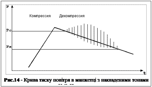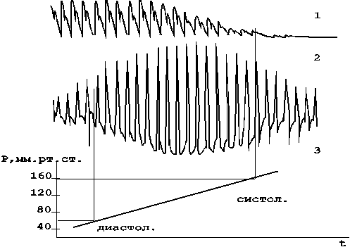 Рис.16 - Виділення тонів при вирахуванні сигналів диференціального датчика Значення тиску повітря в манжетці, при якому з'являється пульс, приймається за систолічний АТ (Рис.17). Визначення мінімального тиску даним способом сполучено зі значними похибками. За критерій рівності тиску повітря в манжетці мінімальному тиску може бути прийняте зменшення амплітуди пульсацій при декомпресії повітря / 38 /. Однак цей критерій не є досить точним і однозначний для автоматичного визначення параметрів АТ. Тільки при реографічному записі і ручній розшифровці даних можуть бути отримані задовільні результати / 44 /.