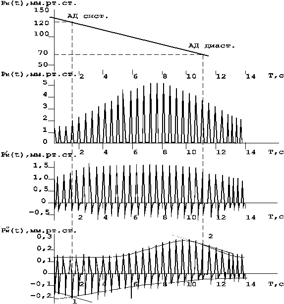 Величина систолічного тиску може бути визначена по початковій ділянці росту тахоосциляцій при плавній декомпресії повітря в манжетці. Для визначення параметрів АТ може бути використаний аналіз другої похідної осциляцій. У цьому випадку значення систолічного АТ приймається рівним величині тиску в манжетці, що відповідає максимуму огинаючій осциляцій “негативної” ділянки кривої (Рис.20). Значення діастолічного АТ дорівнює тиску в манжетці, що відповідає максимальної швидкості убування “позитивної” ділянки. Розглянуті методи визначення параметрів АТ реалізуються в умовах режиму плавної декомпресії (компресії) повітря в оклюзивній манжетці. Вибір швидкості і лінійність декомпресії впливають на точність вимірюваних параметрів. Швидкість декомпресії для мінімізації похибки підтримують на рівні 2 мм рт. ст. на один межпульсовой інтервал.