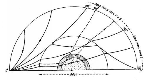 Сильное землетрясение порождает объемные волны, которые пронизывают тело планеты, как бы освещая его изнутри. Подобно лучу света сейсмический луч подчиняется законам оптической оптики, законам отражения и преломления. В частности, закон преломления (закон Снеллиуса) выглядит следующим образом